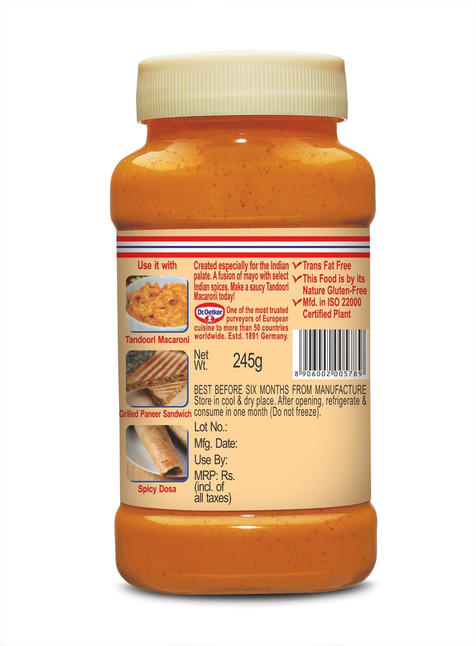 Dr. Oetker FunFoods Tandoori Mayonnaise is the perfect fusion of western mayonnaise with a desi-masala twist of select Indian spices. Perfect for making juicy Kathi-Rolls, Vada Pao, and quick-fix gravy for paneer & chicken dishes or even add a creamy twist to masala dosa.
