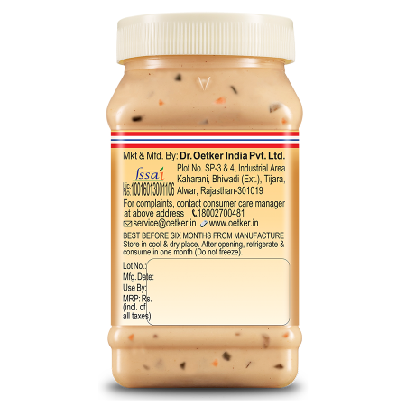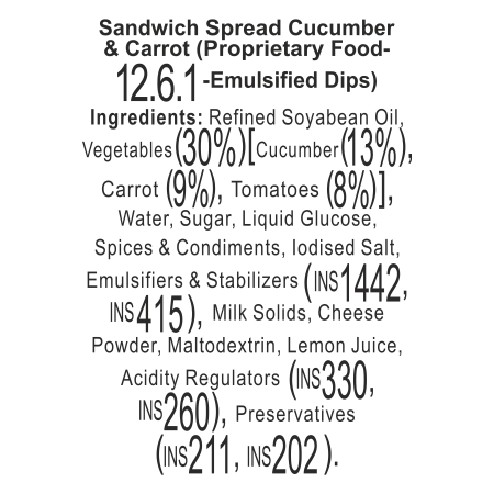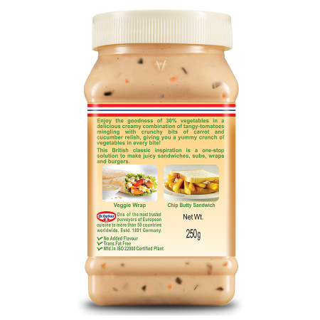 Dr. Oetker FunFoods is the *market leader in Sandwich Spreads and our Cucumber & Carrot is the *highest-selling Sandwich Spread SKU in India. It has the goodness of 30% vegetables in a deliciously creamy combination of tangy-tomatoes with crunchy bits of carrot and cucumber, giving you a crunch of vegetables in every bite! Perfect for making juicy sandwiches, subs, wraps and burgers.