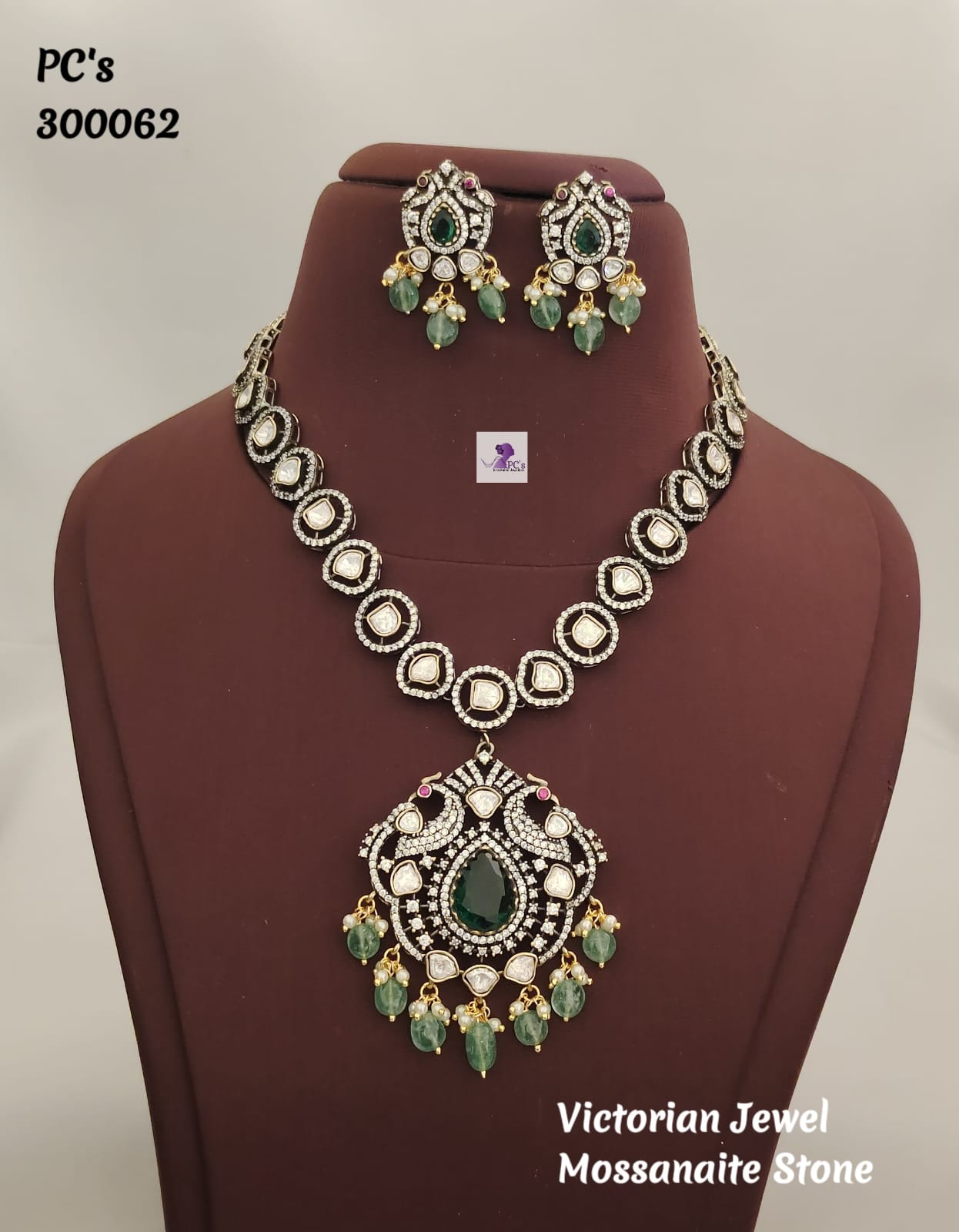 A necklace that draws inspiration from Victorian-era design aesthetics. It features ornate metalwork, intricate filigree, and delicate details reminiscent of the Victorian era. The use of moissanite gemstones adds a modern touch of brilliance and sparkle, while the peacock detailing introduces a unique and nature-inspired motif.