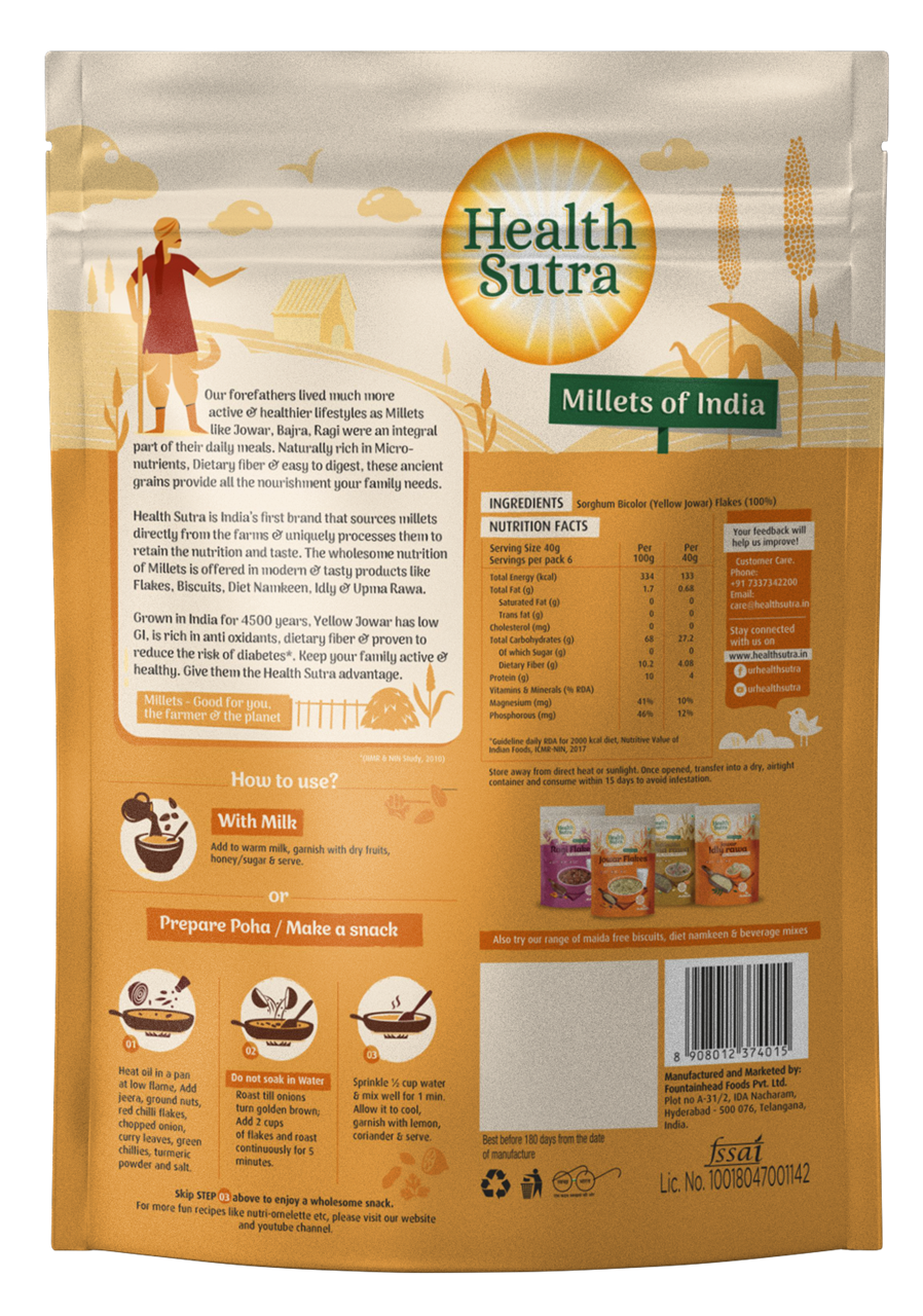 "Highly nutritious breakfast cereal/flakes. Recommended for Diabetics Skip Oats/Cornflakes - Eat Millets Made from Yellow Sorghum Millet (Jowar). These Yelllow Jowar flakes can be had with hot milk for breakfast and can be used to make Poha/Chiwda" "1. Add to warm milk. Add honey/sugar as necessary. Adding dry fruits optional 2. For Poha - Add seasoning grains and vegetables along with a Tbsp of oil to a kadai. Add Yellow Jowar Flakes after the vegetables are done. Sprinkle little water as necessary. Cook on Med. Flame with lid closed for 2 min. Add garnishing. Serve hot (Note: Don’t soak flakes in water)"
